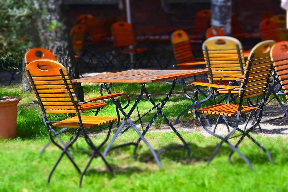 Spoel na het schrobben de houten tuinmeubelen af met een tuinslang of enkele emmers water.